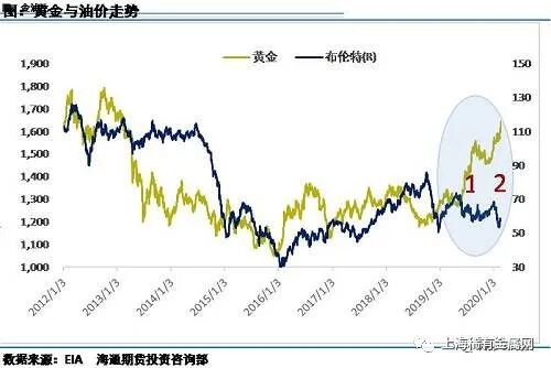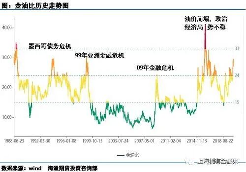 因此我们可以发现黄金和原油同方向变动是常态,只要经济是健康平稳发展,甚至适度通胀阶段(通胀时期原油表现甚至优于黄金表现)二者基本会保持一致节奏。但当发生经济动荡、政治局势不稳时就极容易出现金油比异动显现。正是基于以上黄金、原油的地位和作用,目前市场较为关注的“金油比”的意义在于衡量经济是否出现问题。金油比走势的背后是大量专业机构资金在大类资产配置方面的选择,而这个选择反应了当前阶段投资者对于经济评估后的观点。金油比走低或者处在低位则意味着黄金低、原油高,再结合黄金、原油其本身绝对值表现,来判断是经济处在良性发展阶段,趋势延续性如何;如果金油比处于高位或快速走高则反映经济衰退或经济危机出现。