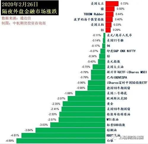 1. 今晨美股标普500指数跌3.03%;欧洲Stoxx50指数跌1.99%;美元指数跌0.32%;WTI原油跌2.42%;Brent原油跌2.21%;伦铜跌0.18%;黄金跌1.49%。美豆涨0.50%;美豆粕涨0.27%;美豆油跌0.74%;美糖跌0.14%;美棉跌1.03%;CRB指数跌1.22%,BDI指数涨0.40%。离岸人民币CNH升0.09%报7.0298;德银X-Trackers嘉实沪深300(160706)中国A股ETF跌0.14%。